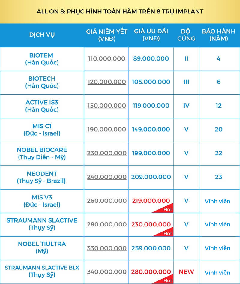 (Giá trọn gói đã bao gồm 8 Implant + 8 Multi Abutment và 14 Răng Toàn Sứ)