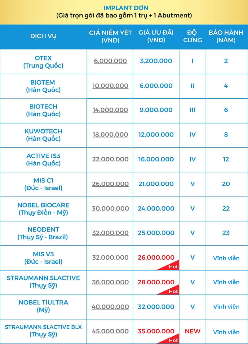 Trồng răng Implant giá bao nhiêu tuỳ thuộc vào phương án mà bác sĩ trao đổi với Quý khách sau khi thăm khám. Quý khách có thể tham khảo giá của từng trụ Implant đơn lẻ qua bảng bên dưới. Nếu cần tư vấn thêm để hiểu rõ về các dòng trụ này, Quý khách hãy liên hệ với chúng tôi qua Hotline: 0329851079 (Có sử dụng Zalo/Viber) hoặc nhập thông tin vào khung tư vấn bên dưới.