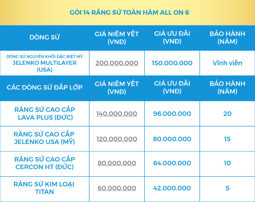(Giá trọn gói đã bao gồm 6 Implant + 6 Multi Abutment và 14 Răng Toàn Sứ)